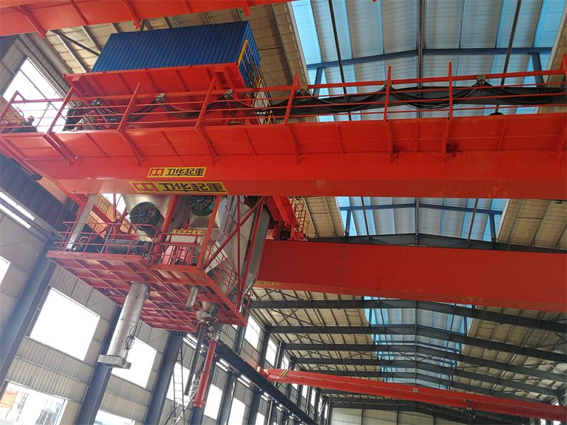 整機主要由工具小車、橋架、大車運行機構、電動葫蘆、電氣控制系統組成。工具小車由吸卸料系統、夾鉗裝置、小車架、小車運行機構及司機室等組成。全車采用變頻加PLC控制。
