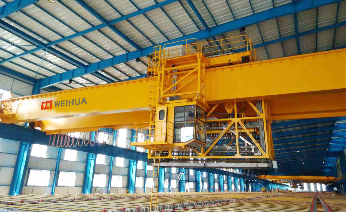 電解銅專用起重機(jī)是針對(duì)電解銅的生產(chǎn)工藝要求而設(shè)置的一種專用起重機(jī)。其主要功能是將已經(jīng)排列好的陰陽(yáng)極板從排距機(jī)組上取下,吊運(yùn)至空槽處,安裝在電解槽中,即裝槽;電解完成后,將陰極板取出并運(yùn)至洗滌機(jī)組;將消耗殆盡的殘極板(即陽(yáng)極板)從電解槽中取出并送往洗滌機(jī)組。